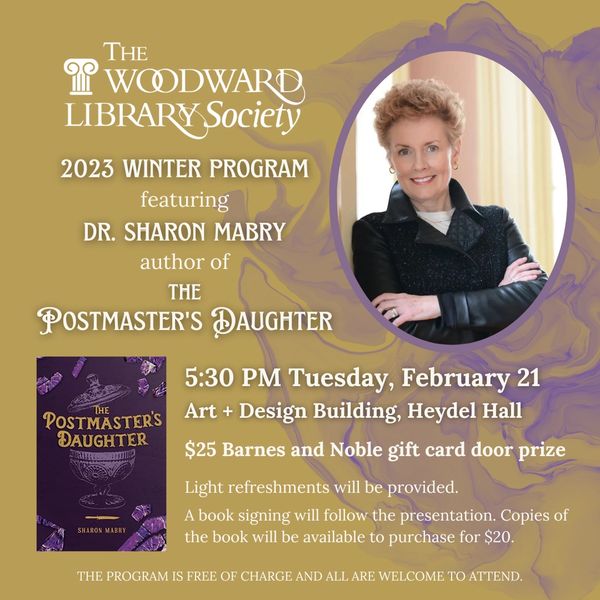 The Woodward Library Society will host Sharon Mabry, author of The Postmaster's Daughter, to discuss her new novel at their Winter Program. Date: Tuesday, February 21, 2023